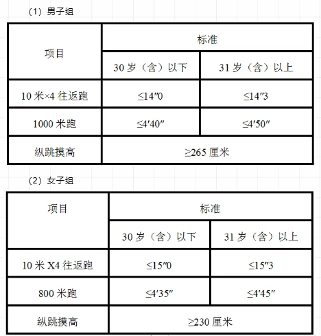 3.參照《關于印發公安機關錄用人民警察體能測評項目和標準(暫行)的通知》(人社部發〔2011〕48號)的項目及測試規則,結合《公安民警體育鍛煉達標手冊》成績標準,體能測評的項目和標準如下: