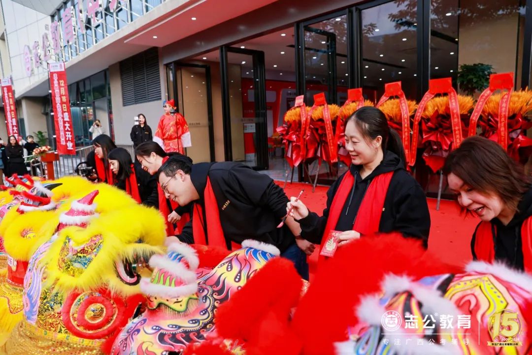 志公教育還專門請來了舞獅隊,舞獅點睛是重頭戲,董事長李勇帶領著公司領導們手持毛筆蘸取朱砂,對獅頭天庭進行點睛。
