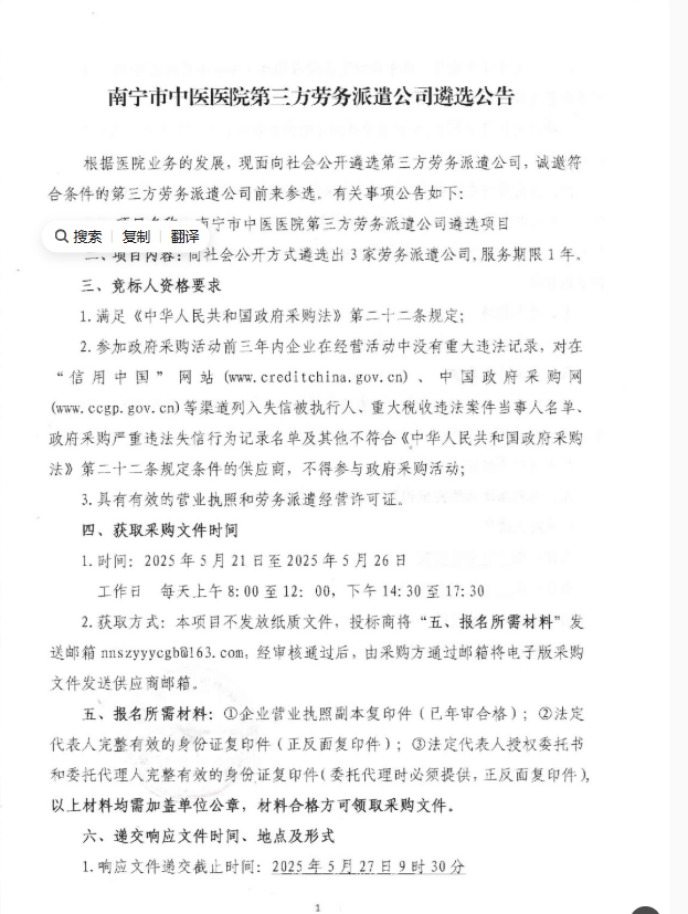 2025年廣西南寧市中醫醫院第三方勞務派遣公司遴選公告