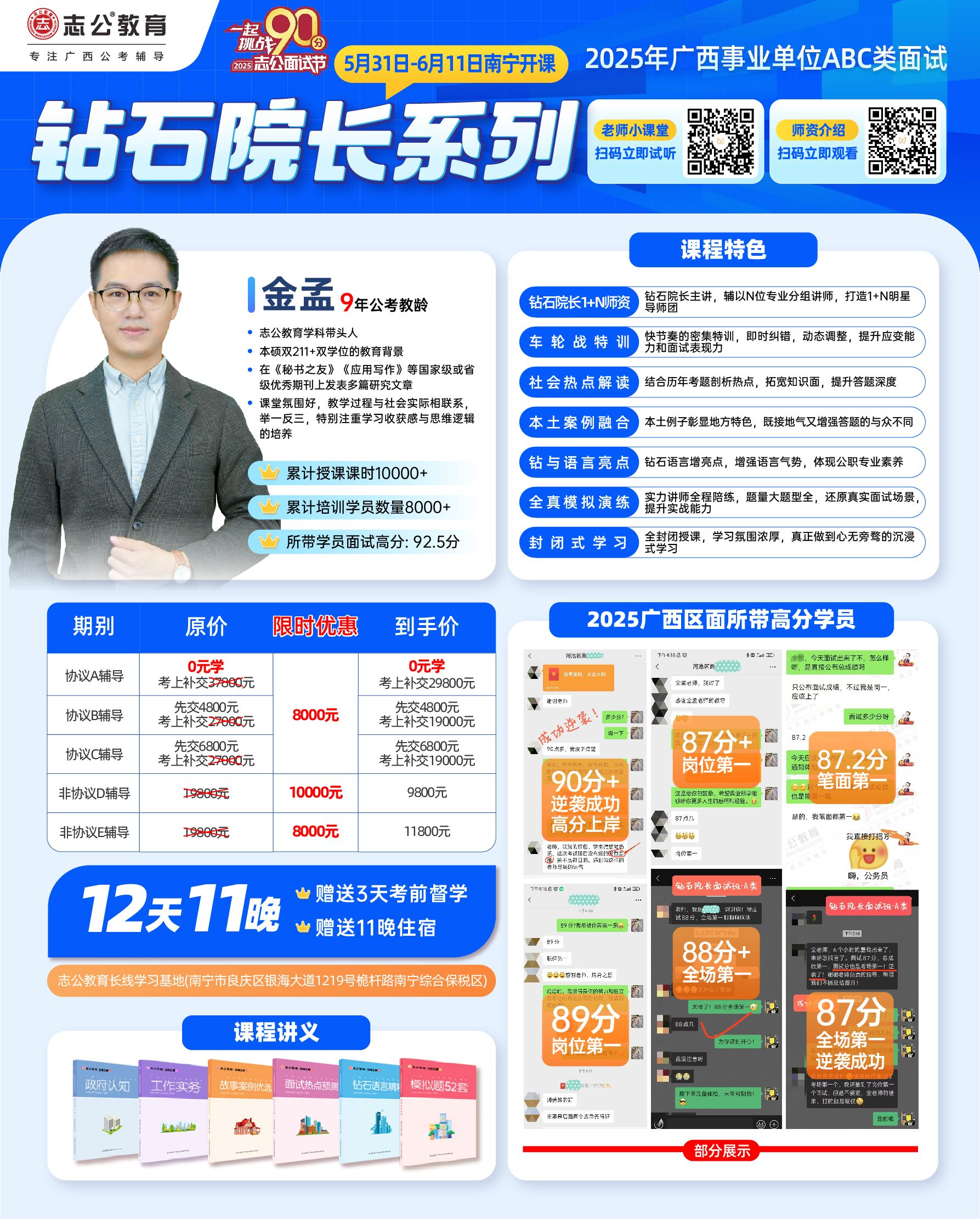 志公教育2025廣西事業(yè)單位ABC類面試鉆石院長系列課程,以專業(yè)的師資、科學的課程體系和卓越的教學效果,助力考生備戰(zhàn)考試,共創(chuàng)高分奇跡,實現(xiàn)職業(yè)夢想!