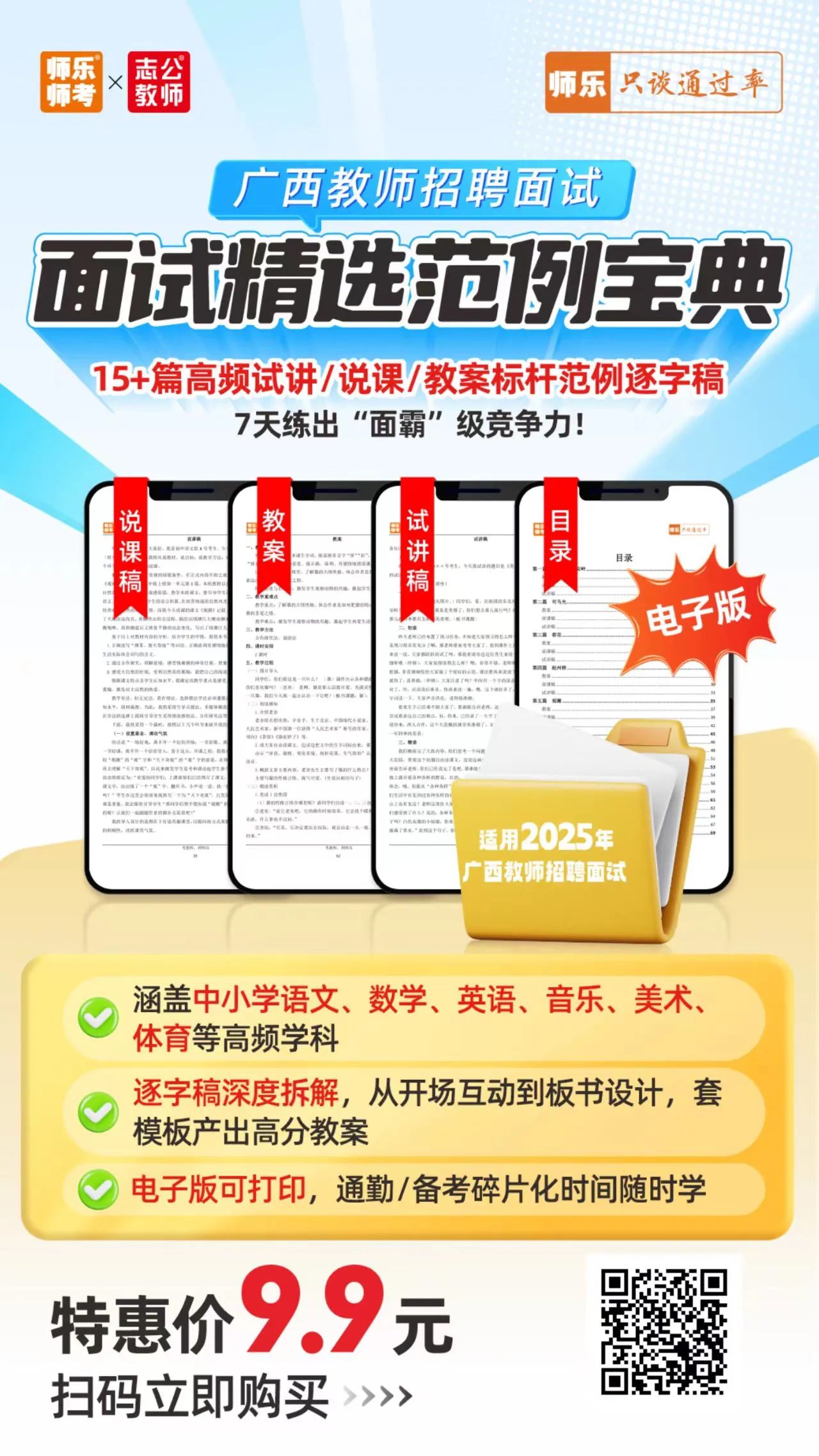 ??寫作邏輯+面試導入金句點撥 ?含13+篇試講+說課+結構化 搶先體驗價:6.9元 ??14地市教招面試zhen題 了解試講/說課/結構化形式及內容 面試禮儀課 ??面試禮儀干貨介紹 正反面案例直觀對比 ??著裝、問候、儀態、言談禮儀等事項介紹 【師樂】廣西教招備考群 ??最新公告 備考資料 ??刷題打卡 考試交流