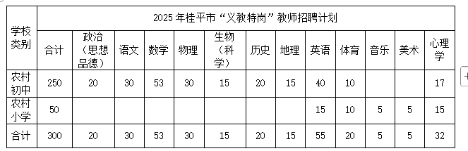 經自治區教育廳、黨委編辦、財政廳、人社廳批準,2025年桂平市“義教特崗”教師招聘計劃共300名,其中初中250名、小學50名。詳情見下表: