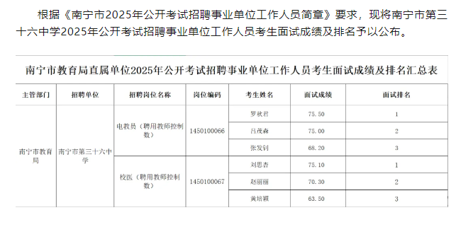 南寧市教育局關于公布南寧市第三十六中學2025年公開考試招聘事業單位工作人員考生面試成績及排名的公告