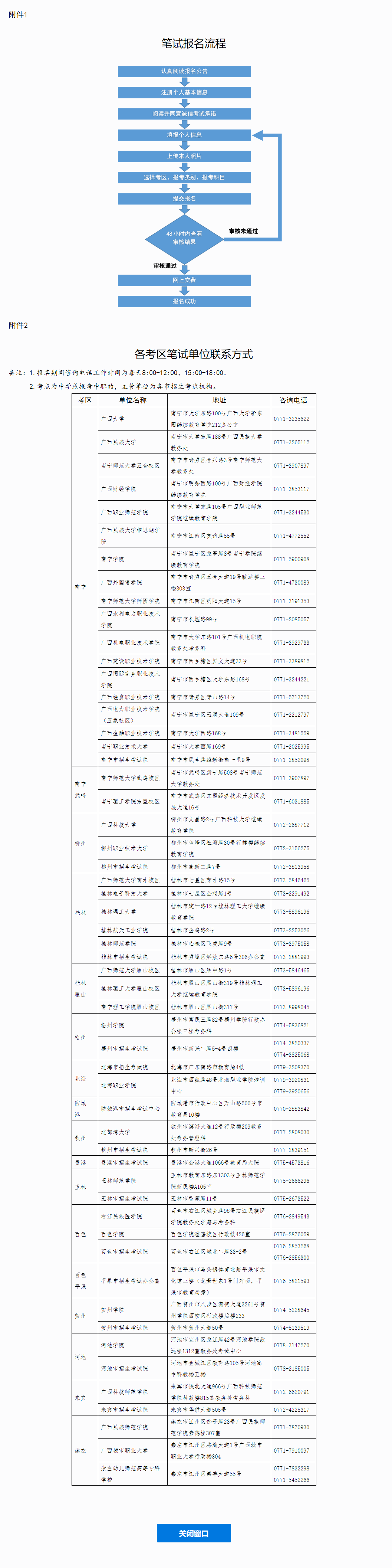 此次筆試共設(shè)17個(gè)考區(qū),分別為:南寧、南寧武鳴、柳州、桂林、桂林雁山、梧州、北海、防城港、欽州、貴港、玉林、百色、百色平果、賀州、河池、來(lái)賓和崇左。其中百色平果考區(qū)僅接受幼兒園、小學(xué)教師資格考試的報(bào)名。
