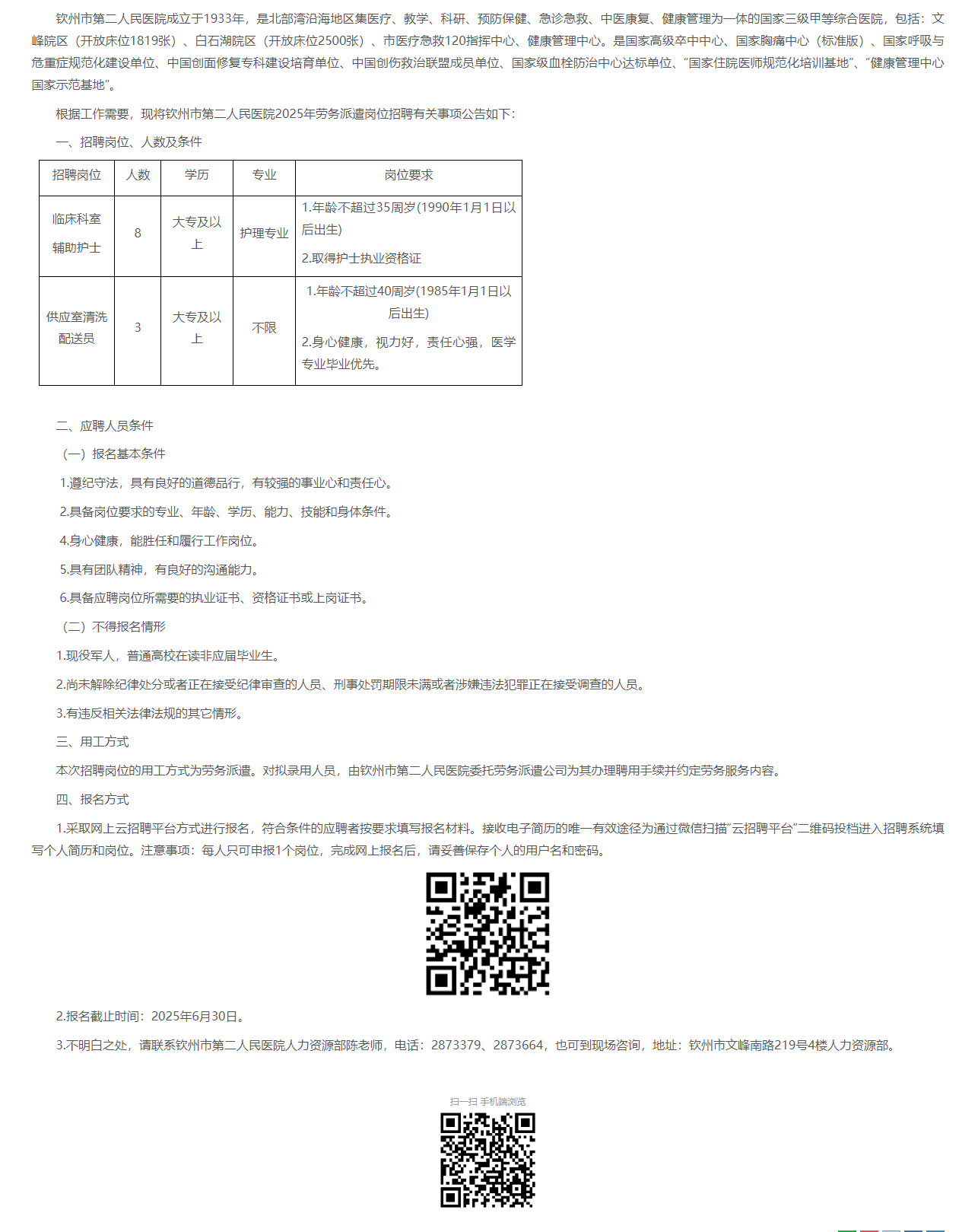 2025年欽州市第二人民醫院勞務派遣崗位人員招聘公告