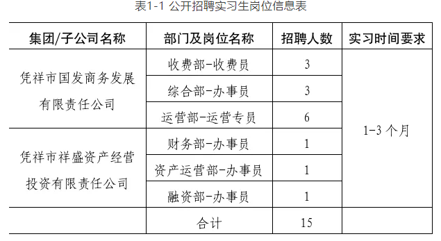 本次共計劃招聘憑祥市國際貿易開發集團有限公司下屬企業實習生崗位15人。具體要求詳見《附件1:憑祥市國際貿易開發集團有限公司2025年公開招聘暑期實習生崗位信息表》