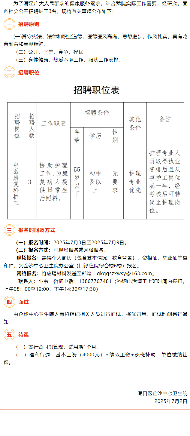 原文標題:港口區企沙中心衛生院招聘護工(第二批)公告