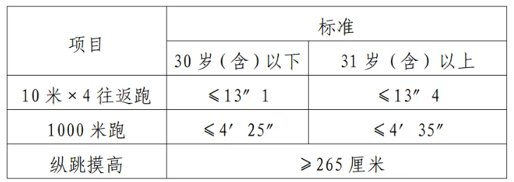 體能測評項目中,縱跳摸高的測試次數不超過3次,10米×4往返跑測評次數為2次,1000米/800米的測評次數均為1次。應聘勤務崗位的人員,體能測評三項全部達標的方為合格;應聘文職崗位的人員,體能測評三項有兩項達標的,視為合格。