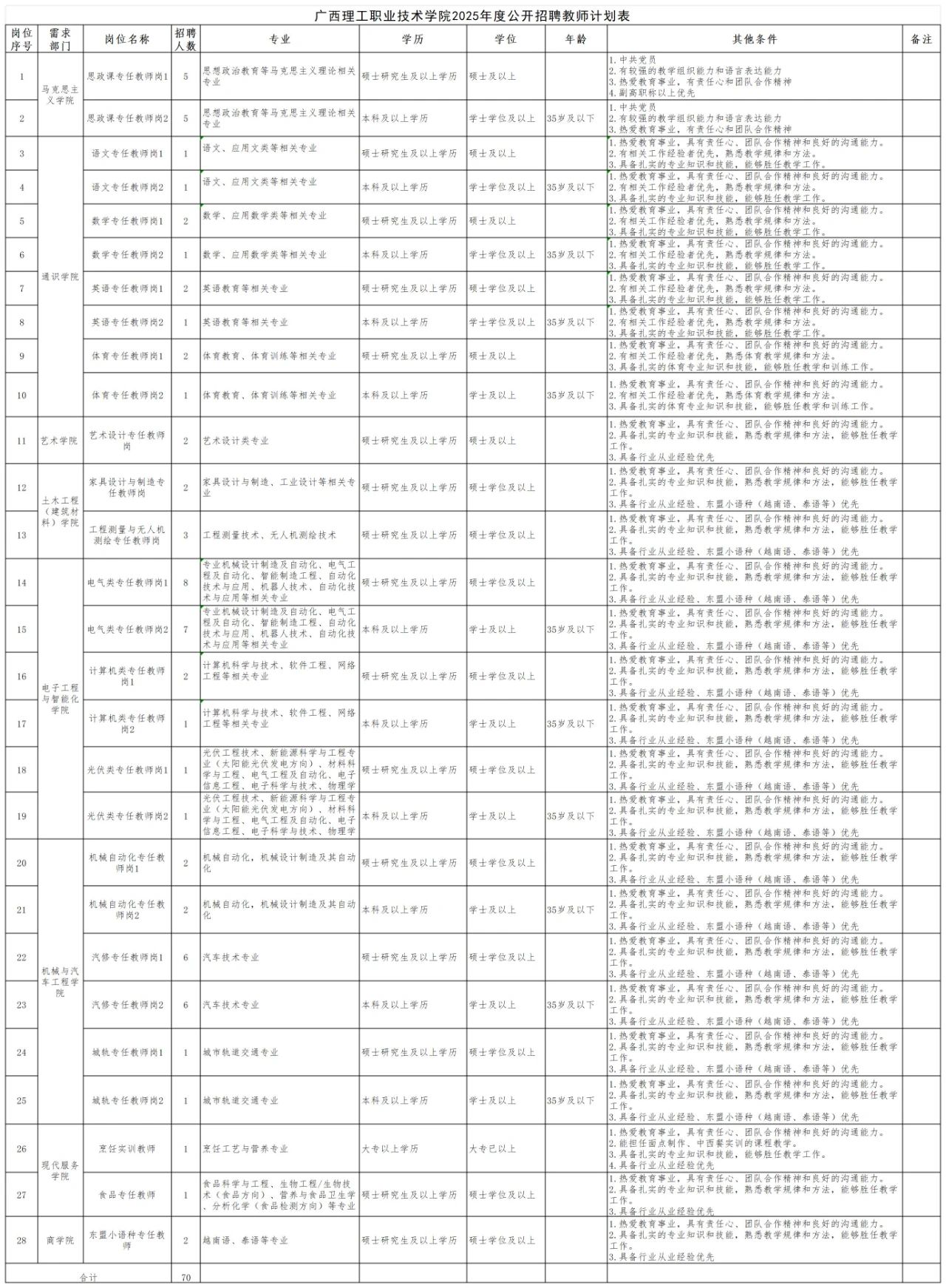 詳見(jiàn)《廣西理工職業(yè)技術(shù)學(xué)院2025年度公開(kāi)招聘教師計(jì)劃表》