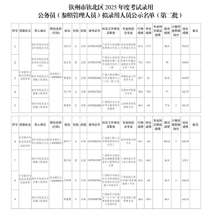 附件:欽州市欽北區2025年度考試錄用公務員(參照管理人員)擬錄用人員公示名單(第二批)