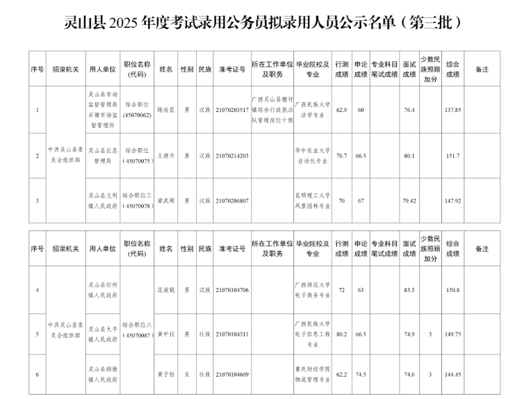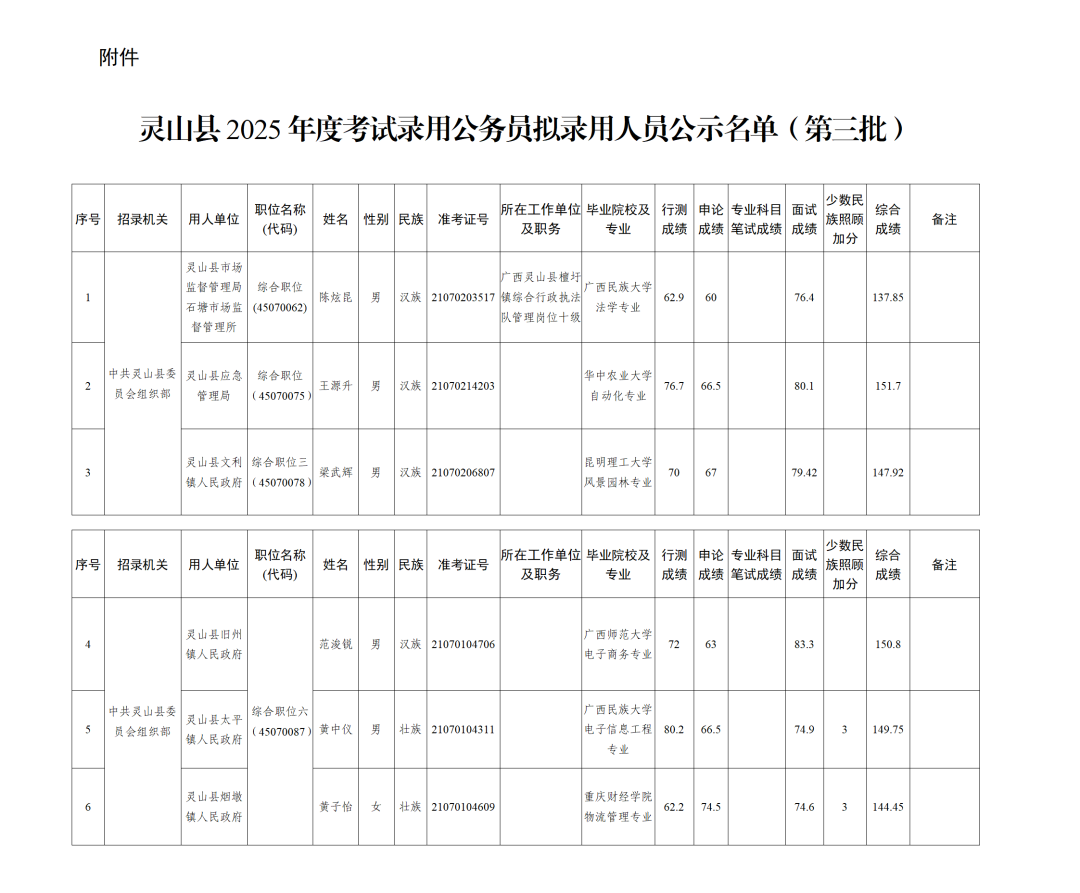 附件:靈山縣2025年度考試錄用公務員擬錄用人員公示名單(第三批)