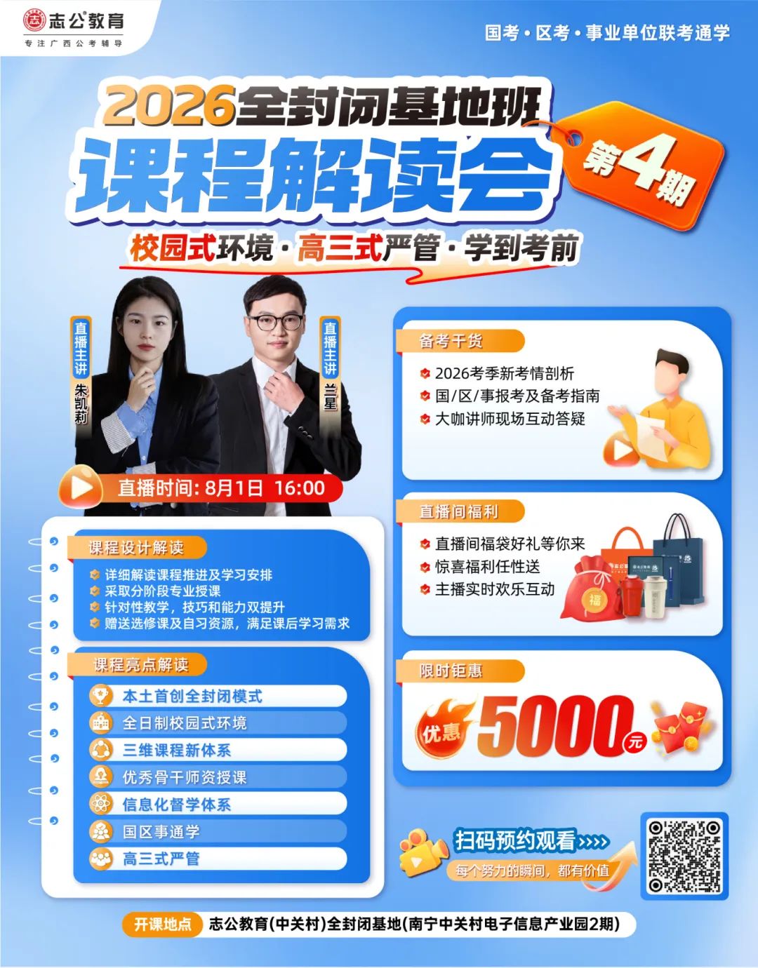 本次解讀會邀請到了朱凱莉、蘭星等資深講師。他們長期深耕公考領域,對廣西的公考形勢了如指掌。在解讀會上,講師們將為大家深度剖析2026考季的新考情、分享報考及備考指南,與同學們進行現場互動,更重要的是進行2026年全封閉基地班第4期課程設計解讀!讓你在備考之初就搶占先機。????